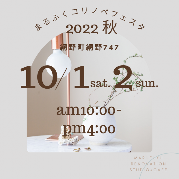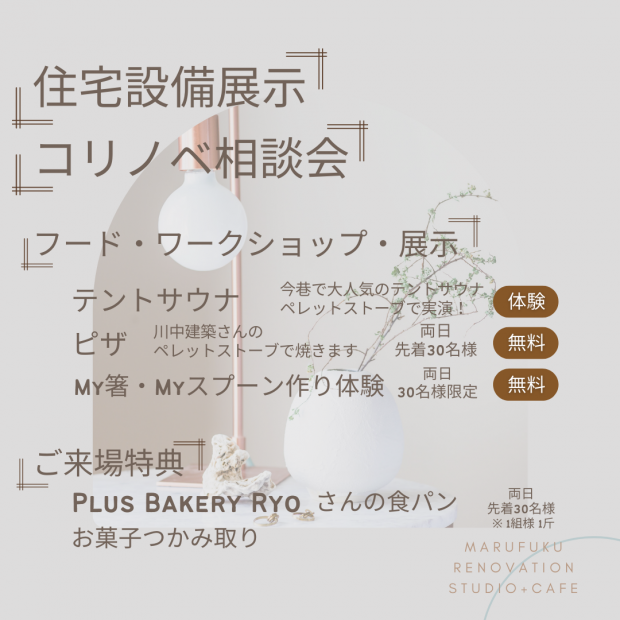 皆さんこんにちは。 まるふくコリノベフェスタ開催のお知らせです。 日時 2022年10月1日(土)・2日(日) 10:00~16:00 会場 marufuku renovation studio+cafe (まるふく産商ショールーム)   *人気メーカーの設備を多数展示 *リノベーション・リフォーム等のご相談 *MY箸・MYスプーン作りワークショップ *ペレットストーブで焼くピザ(数量限定) *ご来場特典もあります! 楽しいイベントをご用意しております! スタッフ一同ご来場お待ちしております。