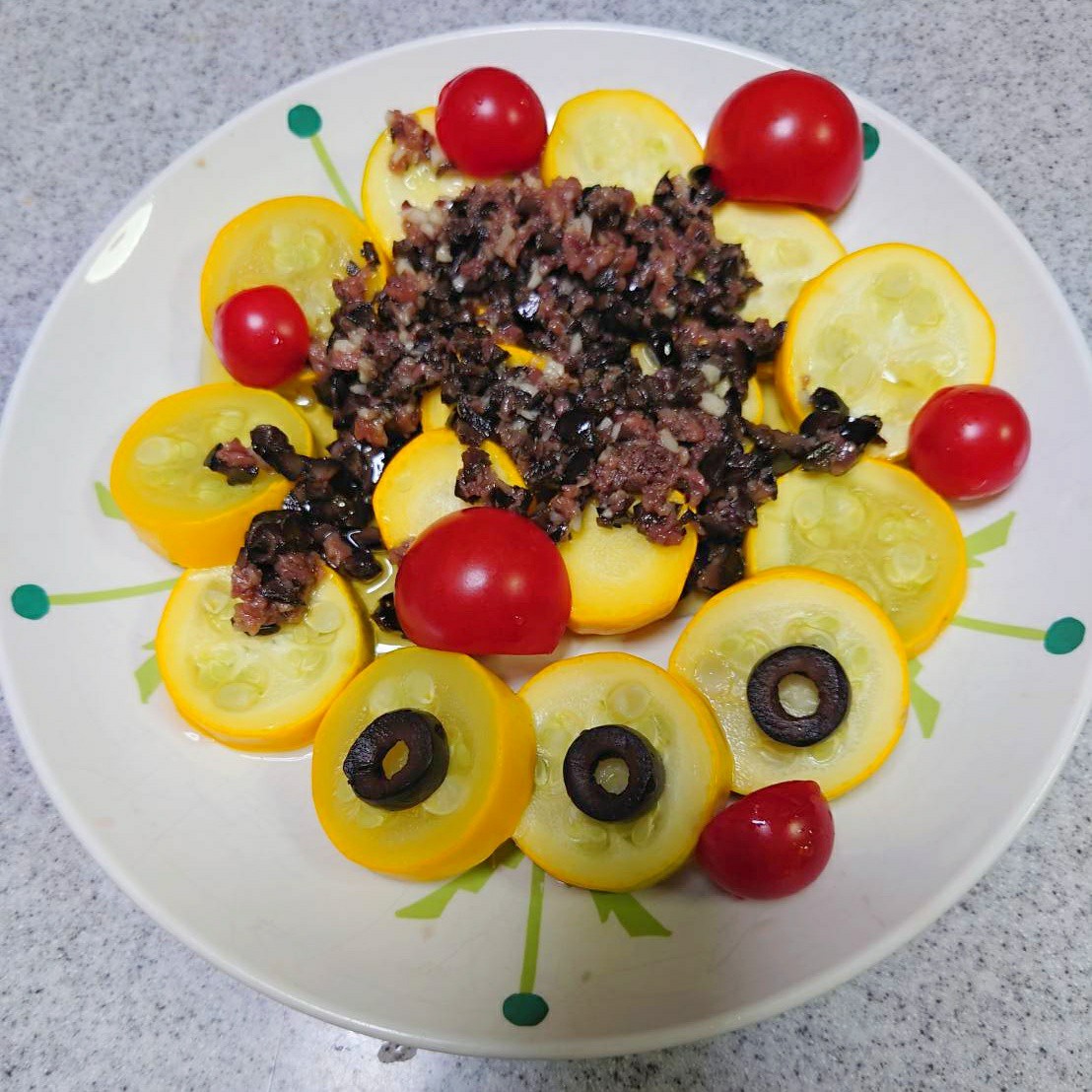友達からズッキーニを頂いたので作ってみました。輪切りにして、レンジでチンして、土台を作ります。上にのっている黒い物は何でしょうか?写真の中にヒントはありますが、ブラックオリーブです。アンチョビ、ニンニクと共に細かく切り、オリーブオイルを加えて混ぜ合わせ、上からかけます。材料さえ揃えば、直ぐに作れて意外に美味しいです。お酒のあてにも普段の食事にも良し、余ったドレッシングは、他の野菜にかけてもおいしいです。