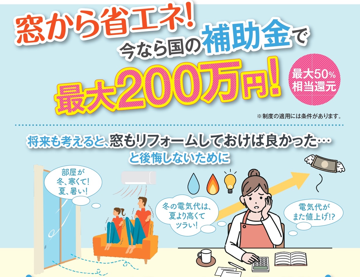皆さんこんにちは。 現在、政府では住宅の省エネリフォームの支援強化策として 先進的窓リノベ事業を推進しています。 内窓の設置や複層ガラスへの交換など、窓を改善することで冷暖房費の節約になります。 窓リノベするなら今が絶好の機会です! 他にも、こどもエコすまい支援事業、高効率給湯器を導入する方への補助金など、 住宅省エネ化支援強化事業がスタートしています。 省エネリフォームをお考えの方は、ぜひお問い合わせください!
